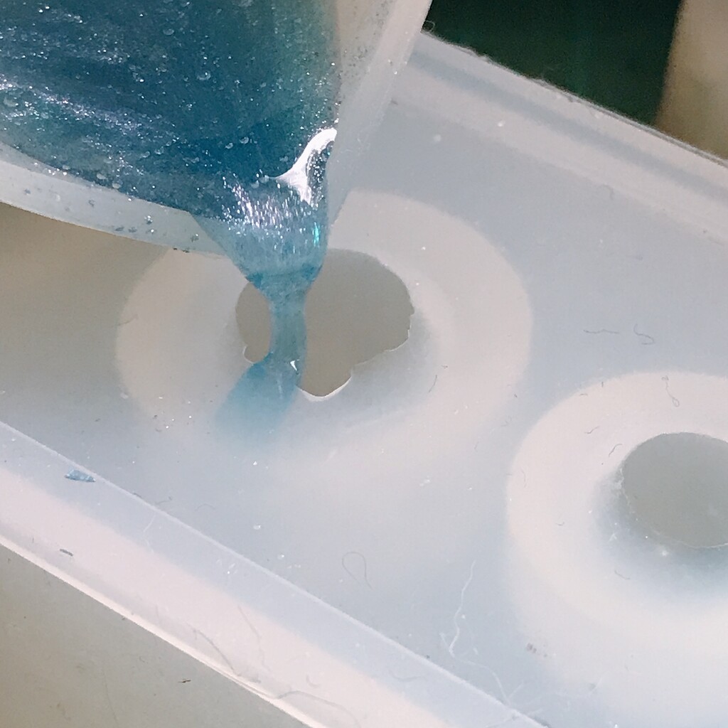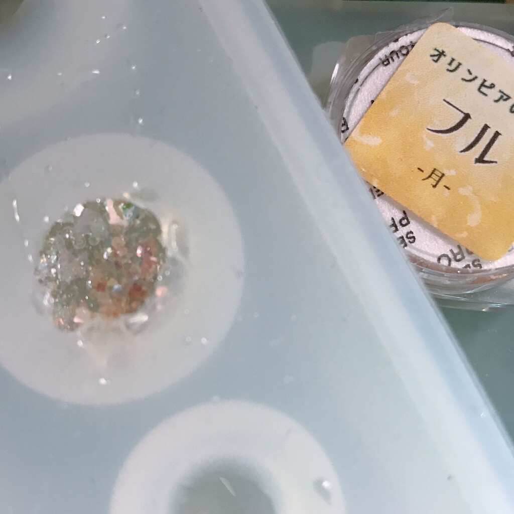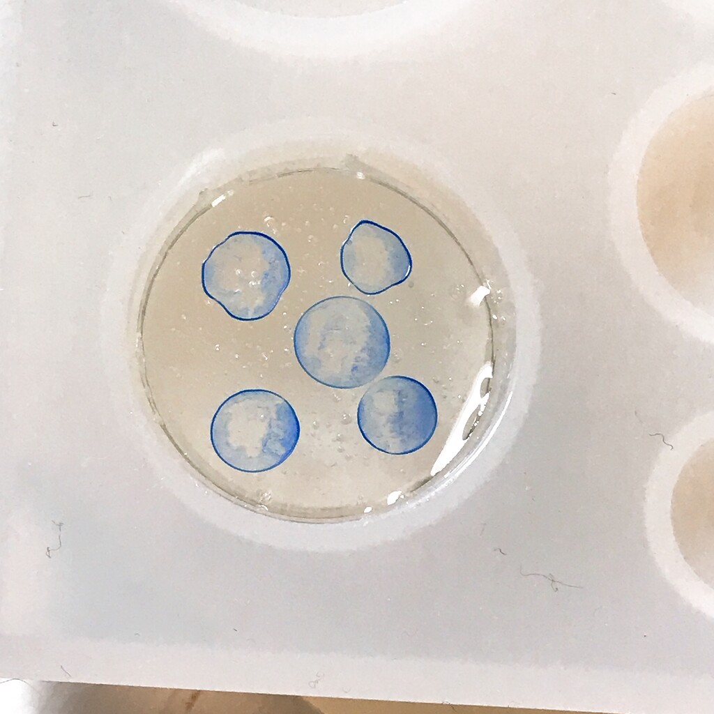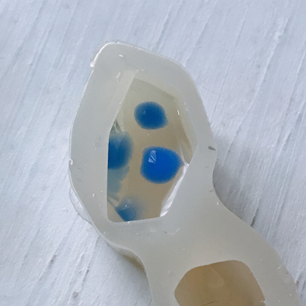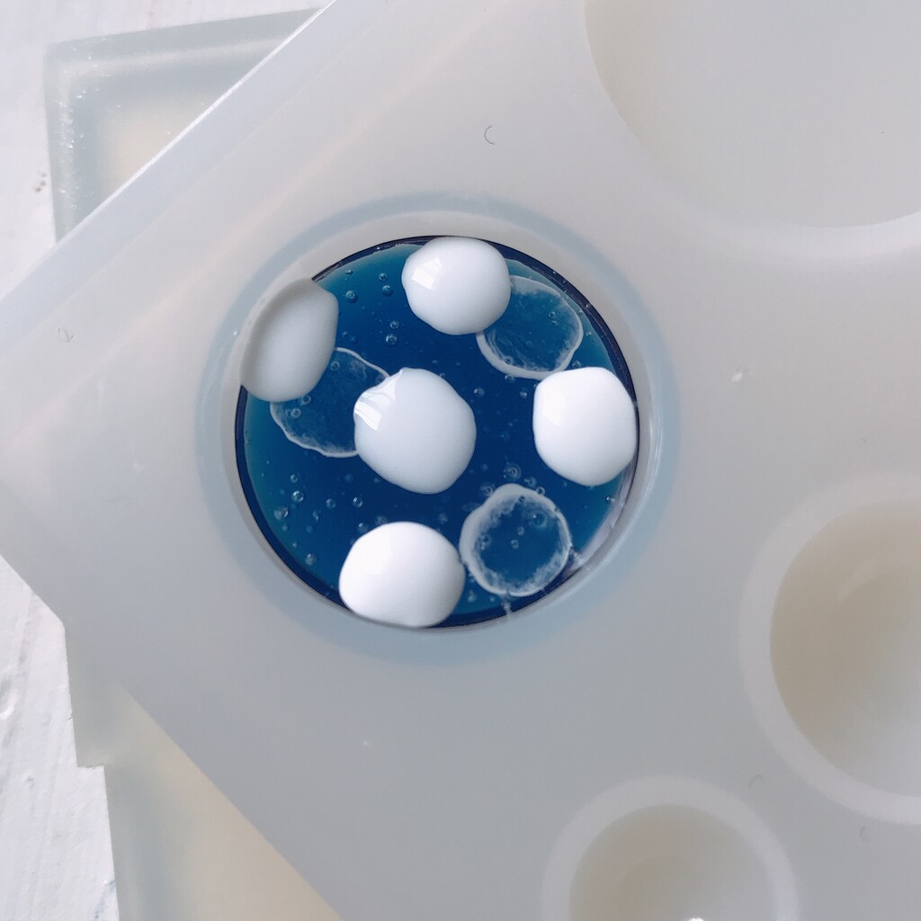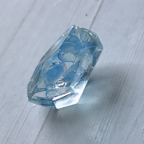 今日の鉱石は、先日やったクラゲ模様を応用して作っていこうと思います。 ↑このクラゲ。まず、モールドにレジンを入れます。半分くらい。硬化します。固めてる間に、絵の具の準備。アクリル絵の具を水で薄めました。これを硬化したレジンの上から落としていきます。ポタポタ ...