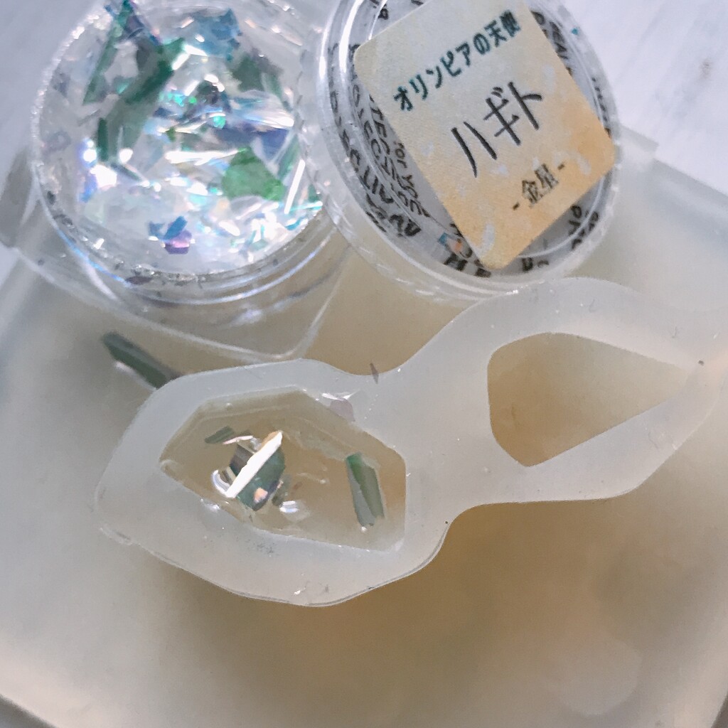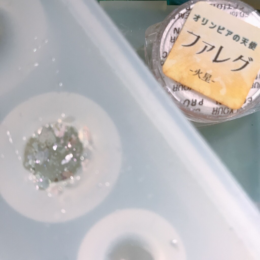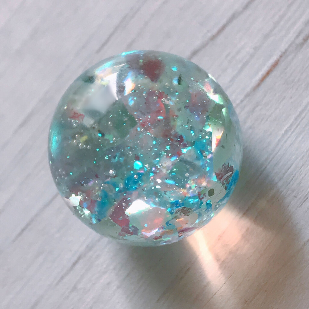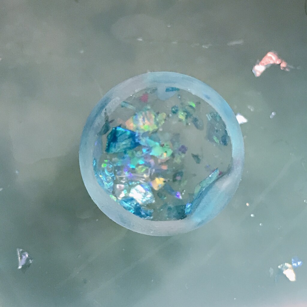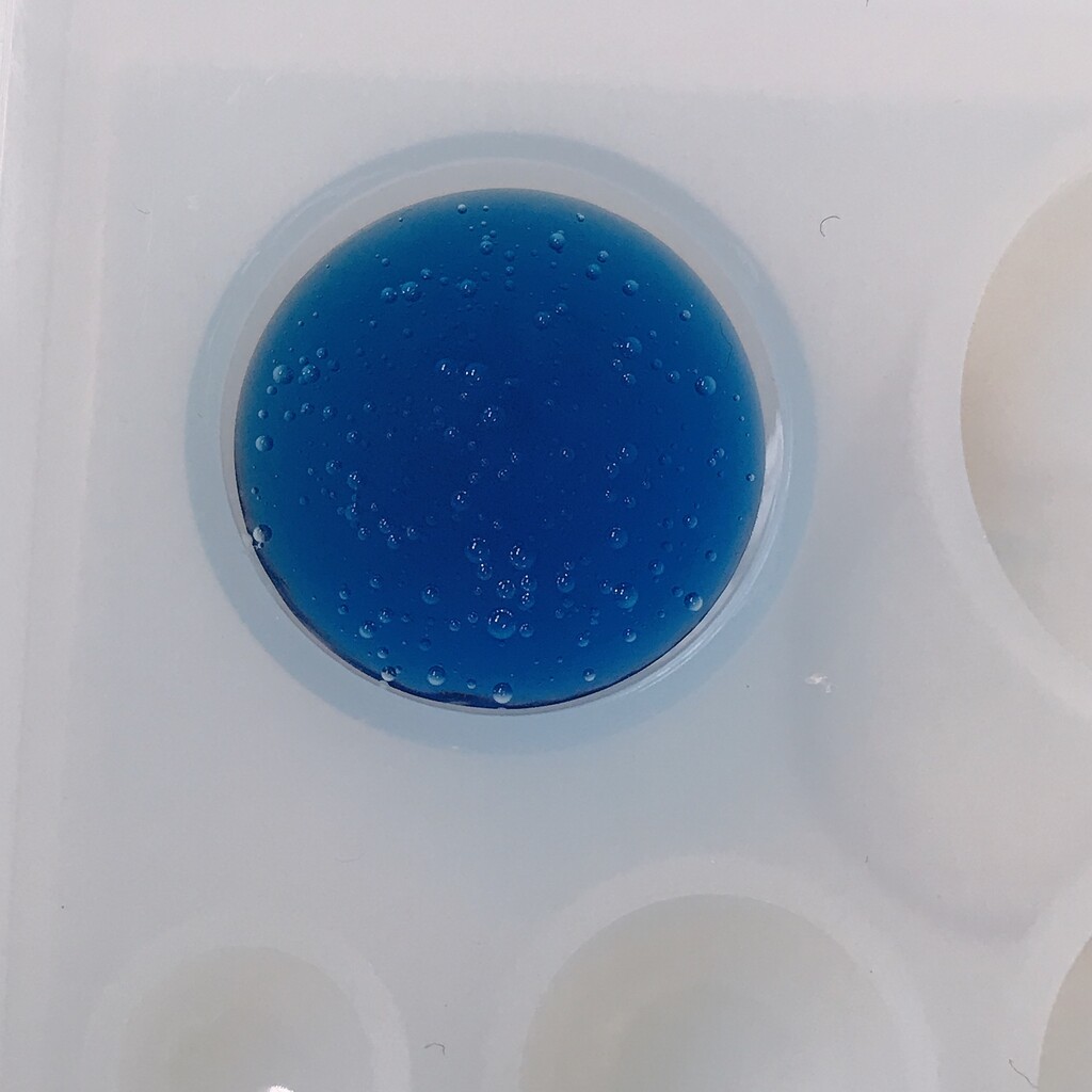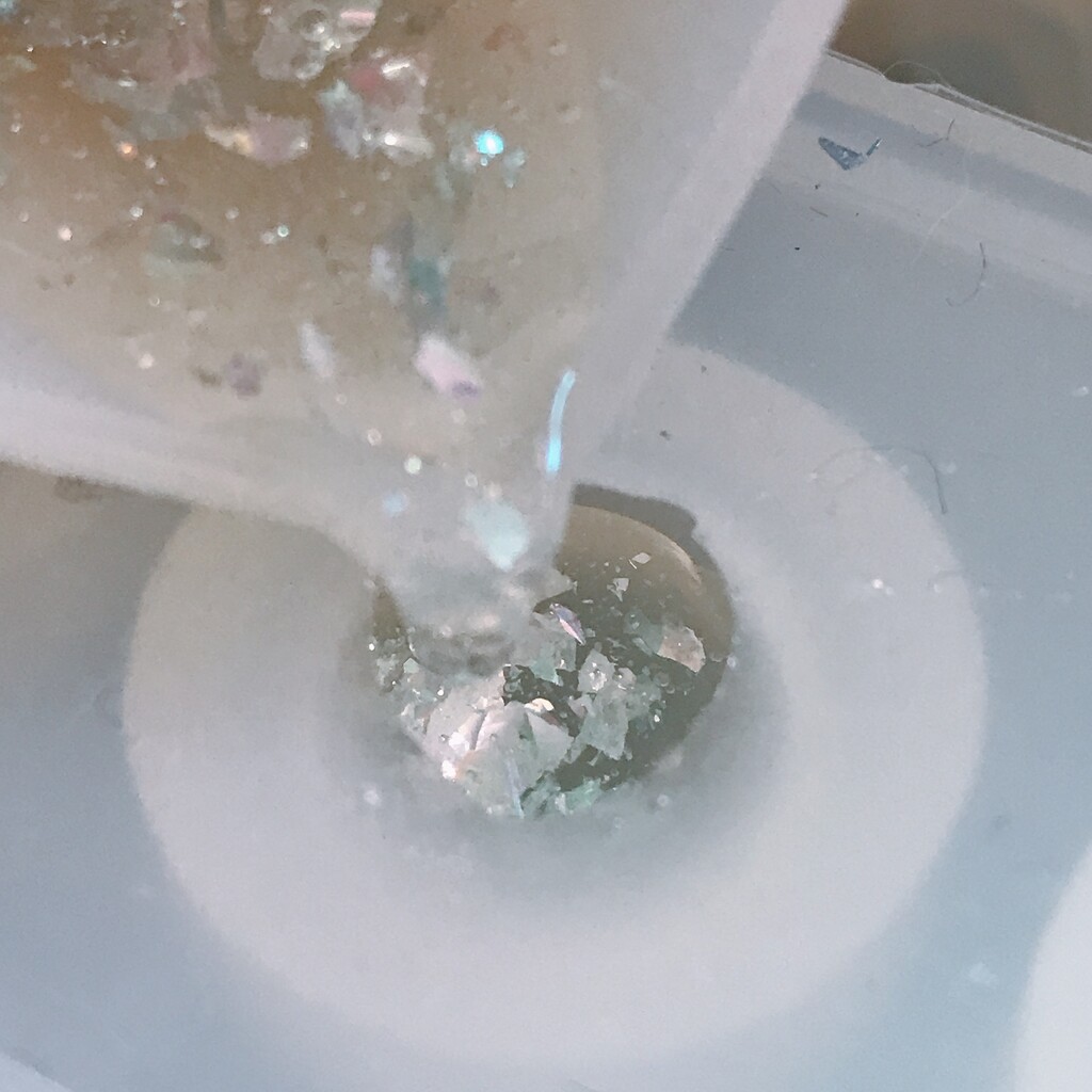 今日の鉱石は、先日やったクラゲ模様を応用して作っていこうと思います。 ↑このクラゲ。まず、モールドにレジンを入れます。半分くらい。硬化します。固めてる間に、絵の具の準備。アクリル絵の具を水で薄めました。これを硬化したレジンの上から落としていきます。ポタポタ ...