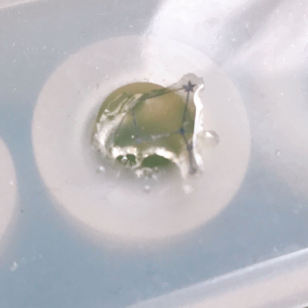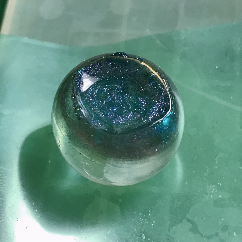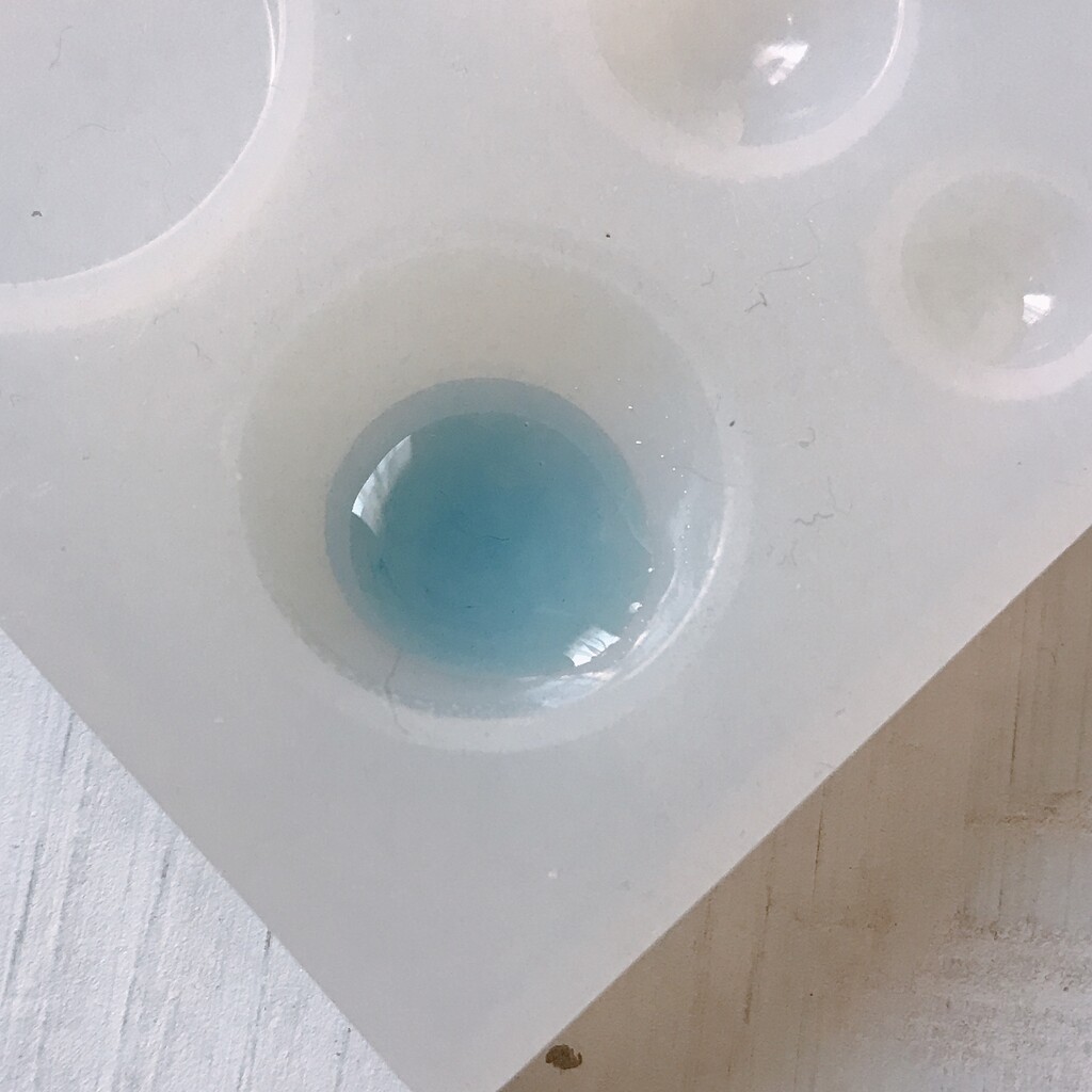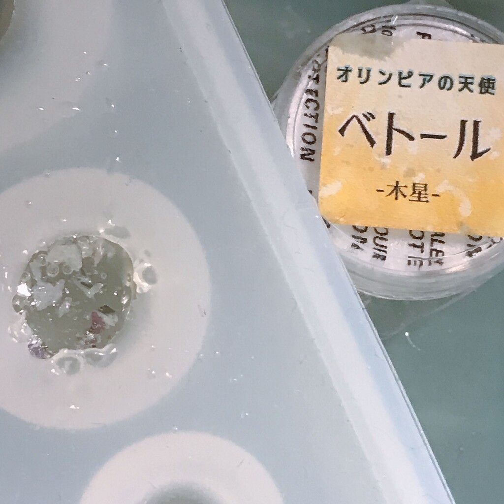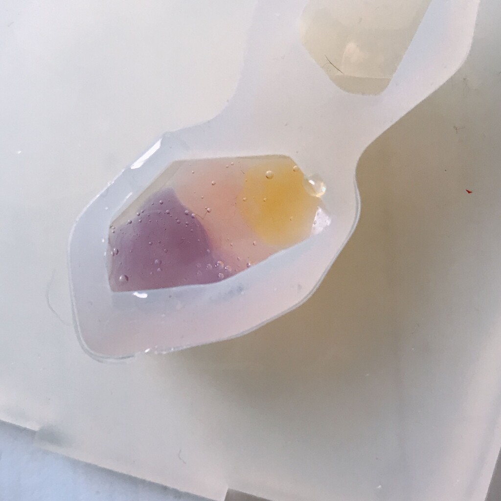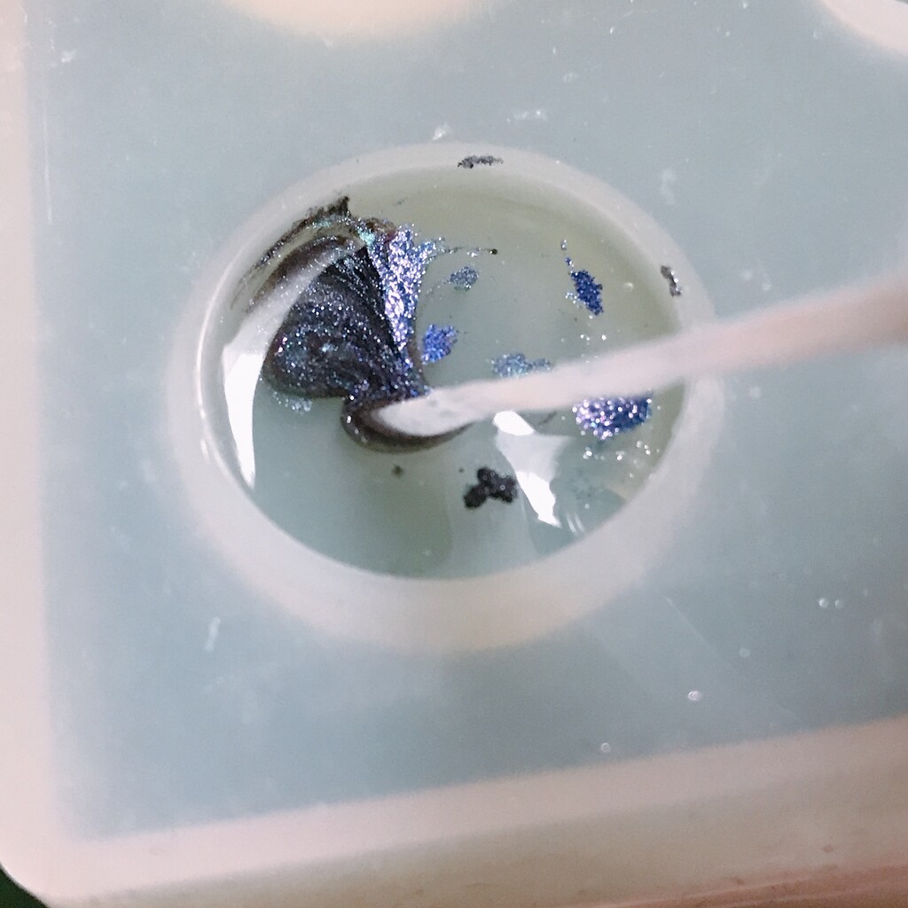 今日の鉱石は、先日やったクラゲ模様を応用して作っていこうと思います。 ↑このクラゲ。まず、モールドにレジンを入れます。半分くらい。硬化します。固めてる間に、絵の具の準備。アクリル絵の具を水で薄めました。これを硬化したレジンの上から落としていきます。ポタポタ ...
