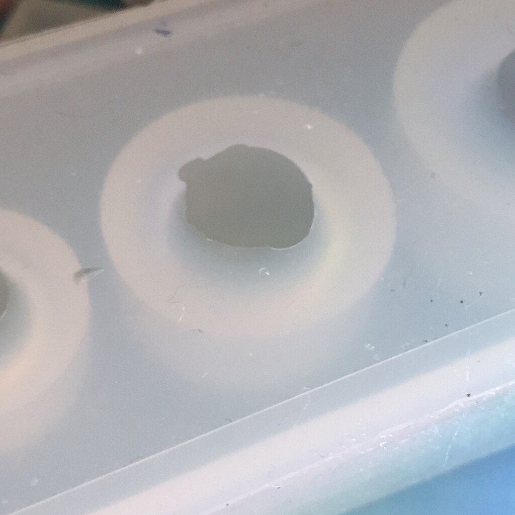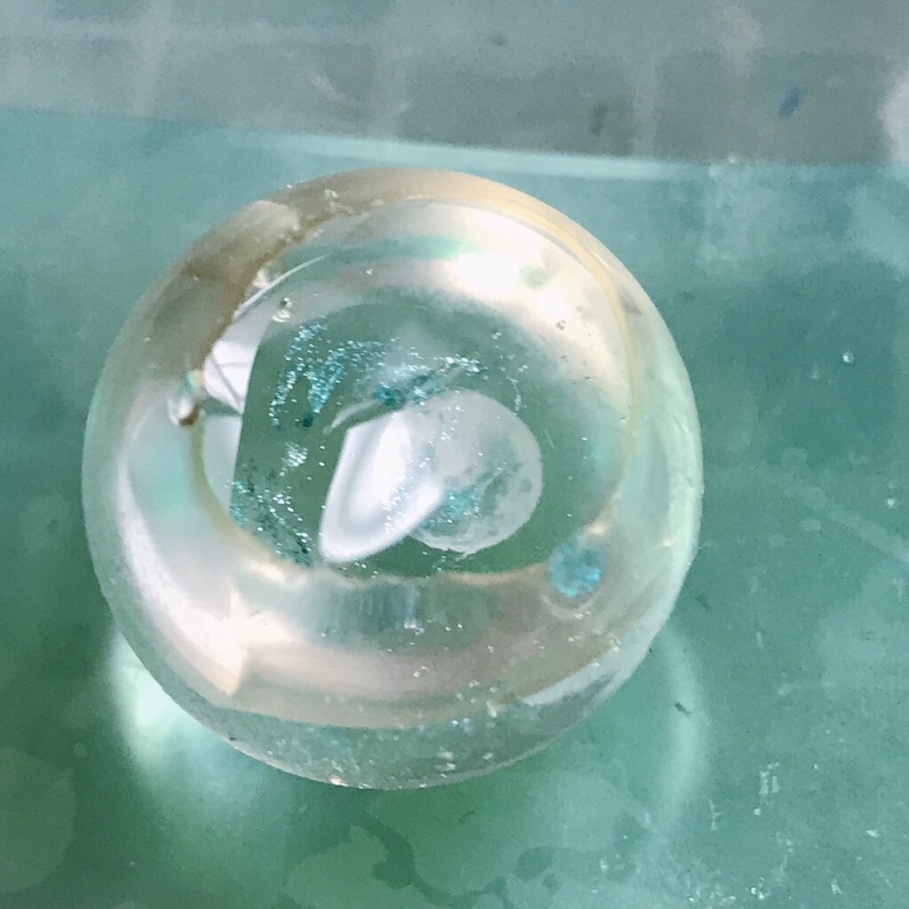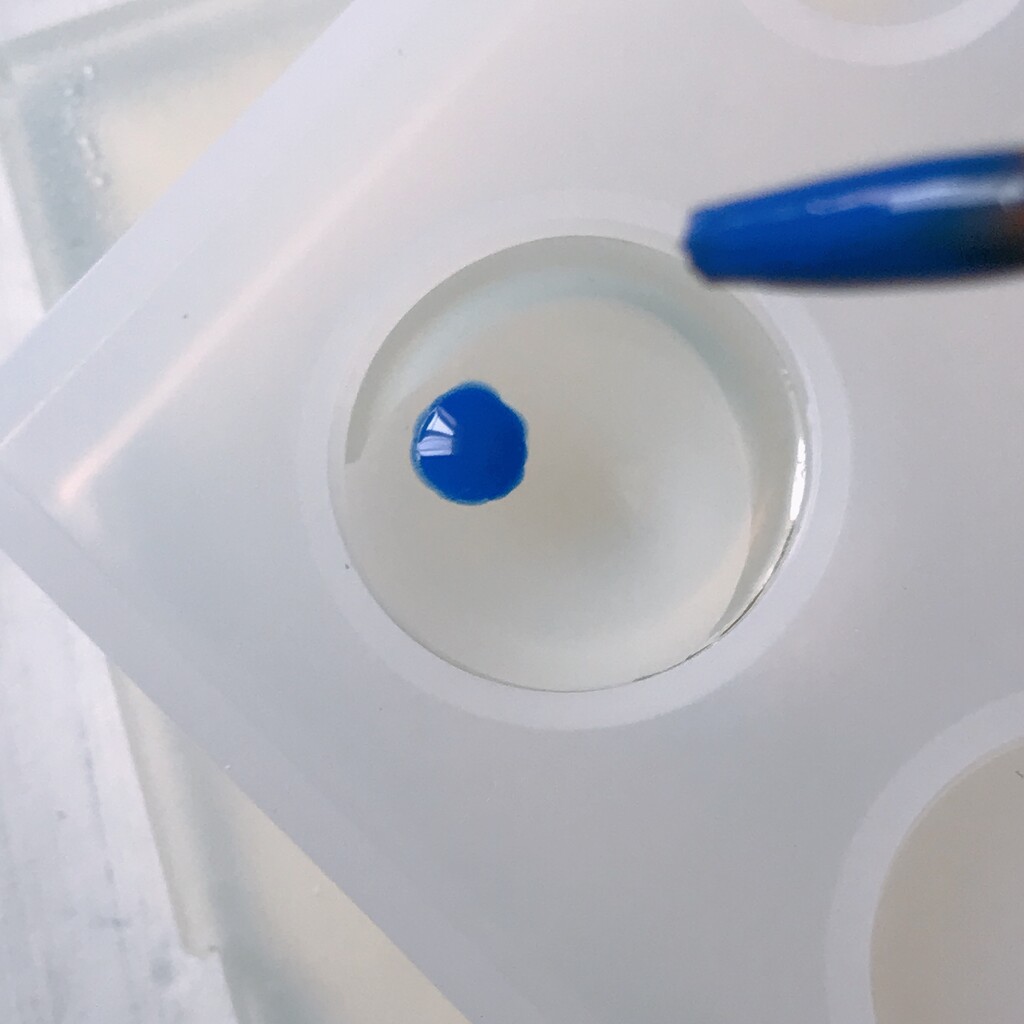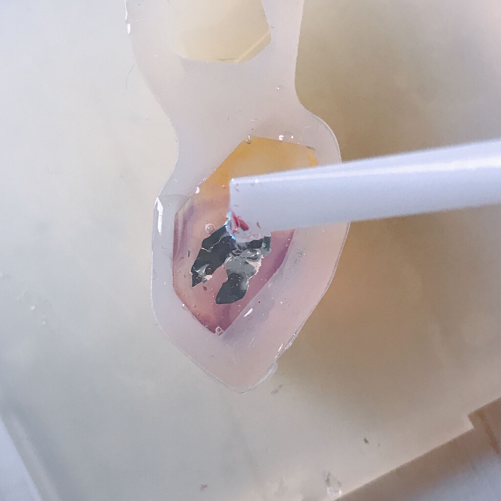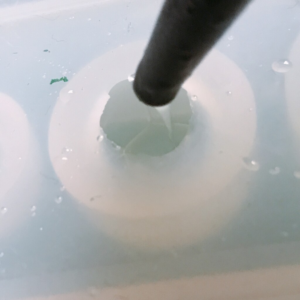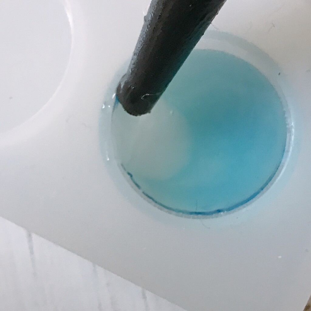 今日の鉱石は、先日やったクラゲ模様を応用して作っていこうと思います。 ↑このクラゲ。まず、モールドにレジンを入れます。半分くらい。硬化します。固めてる間に、絵の具の準備。アクリル絵の具を水で薄めました。これを硬化したレジンの上から落としていきます。ポタポタ ...