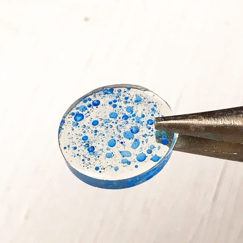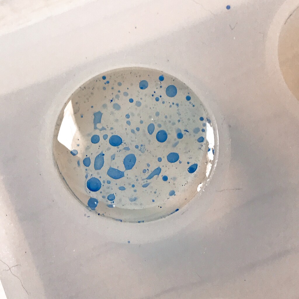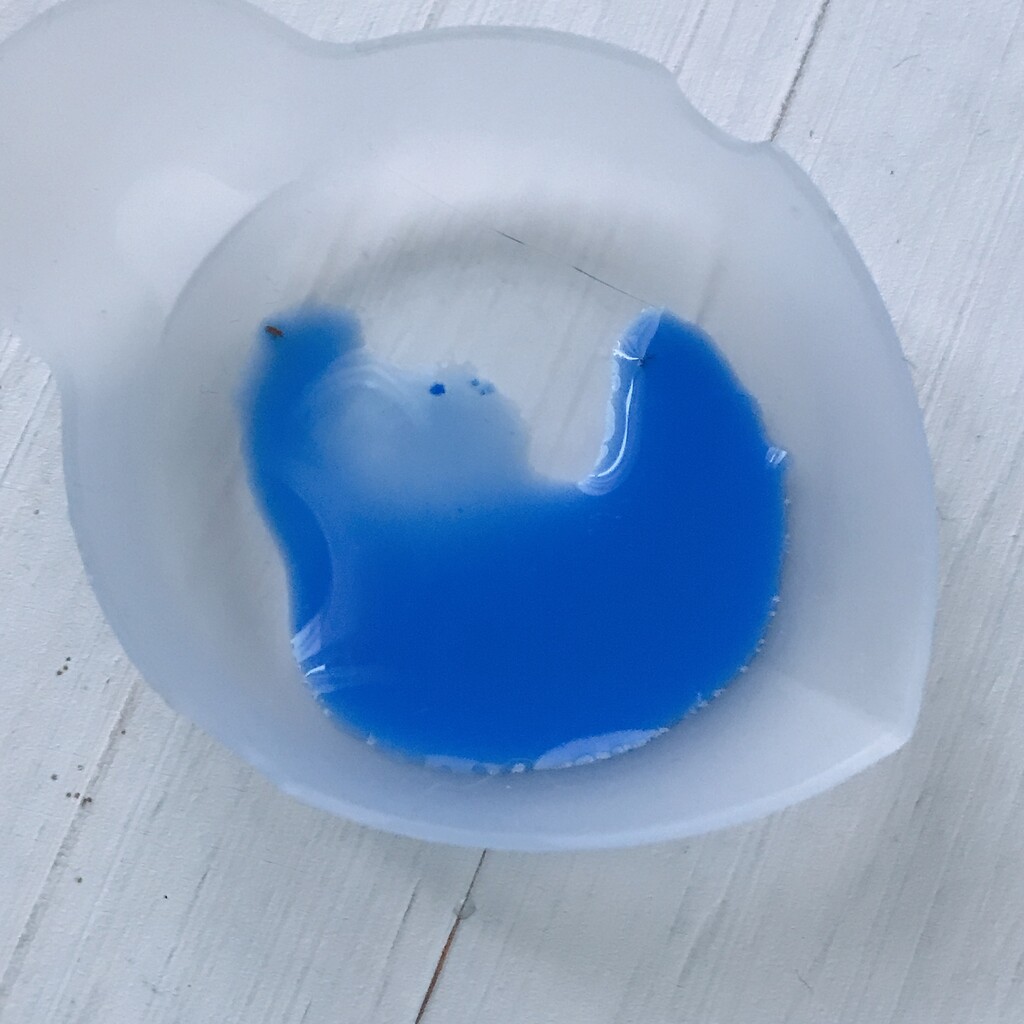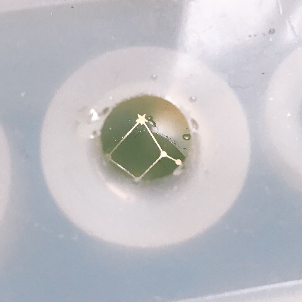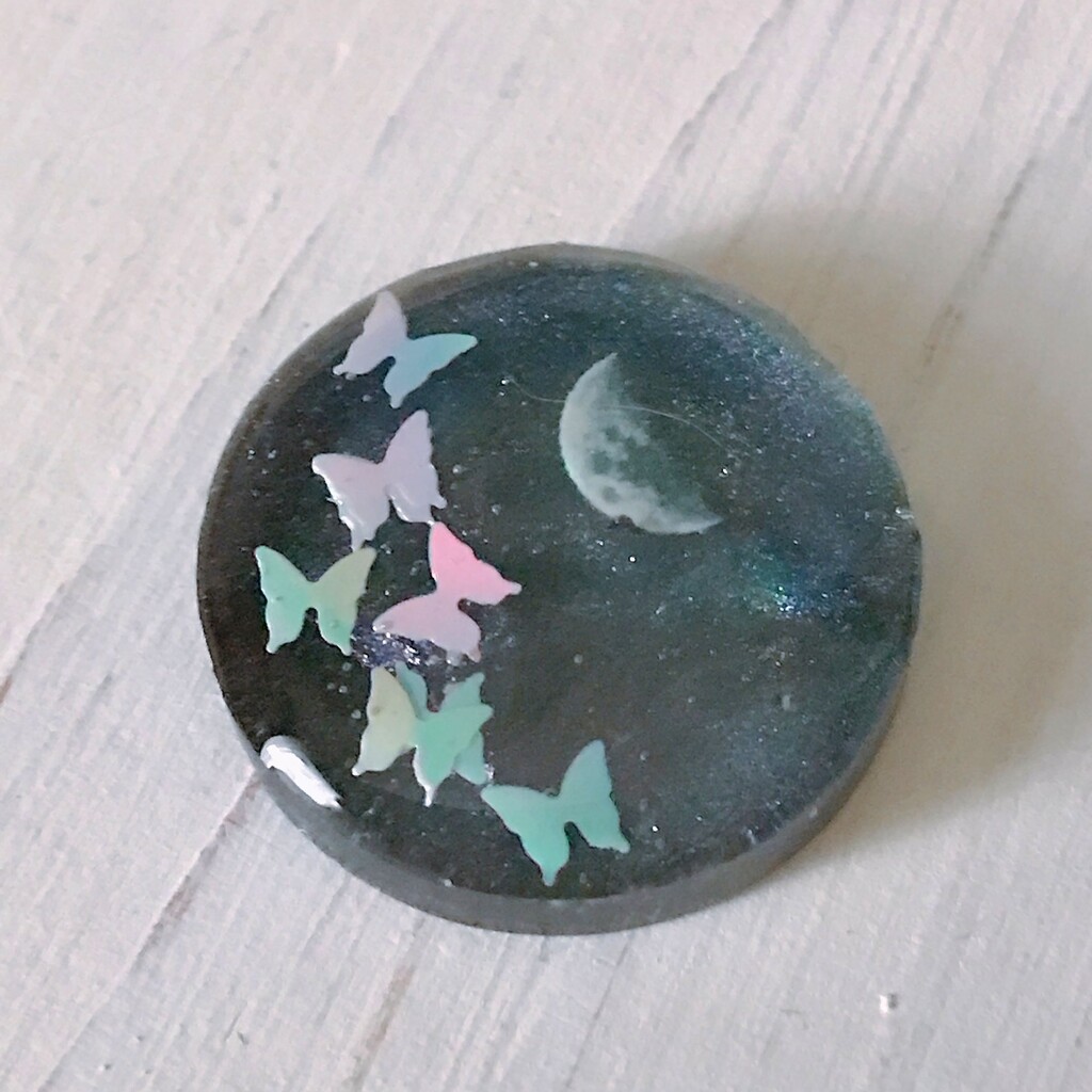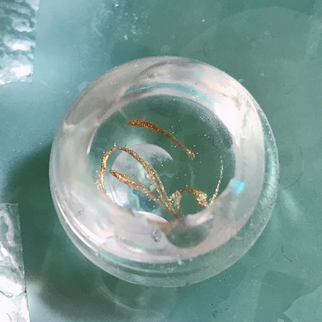 今日の鉱石は、先日やったクラゲ模様を応用して作っていこうと思います。 ↑このクラゲ。まず、モールドにレジンを入れます。半分くらい。硬化します。固めてる間に、絵の具の準備。アクリル絵の具を水で薄めました。これを硬化したレジンの上から落としていきます。ポタポタ ...