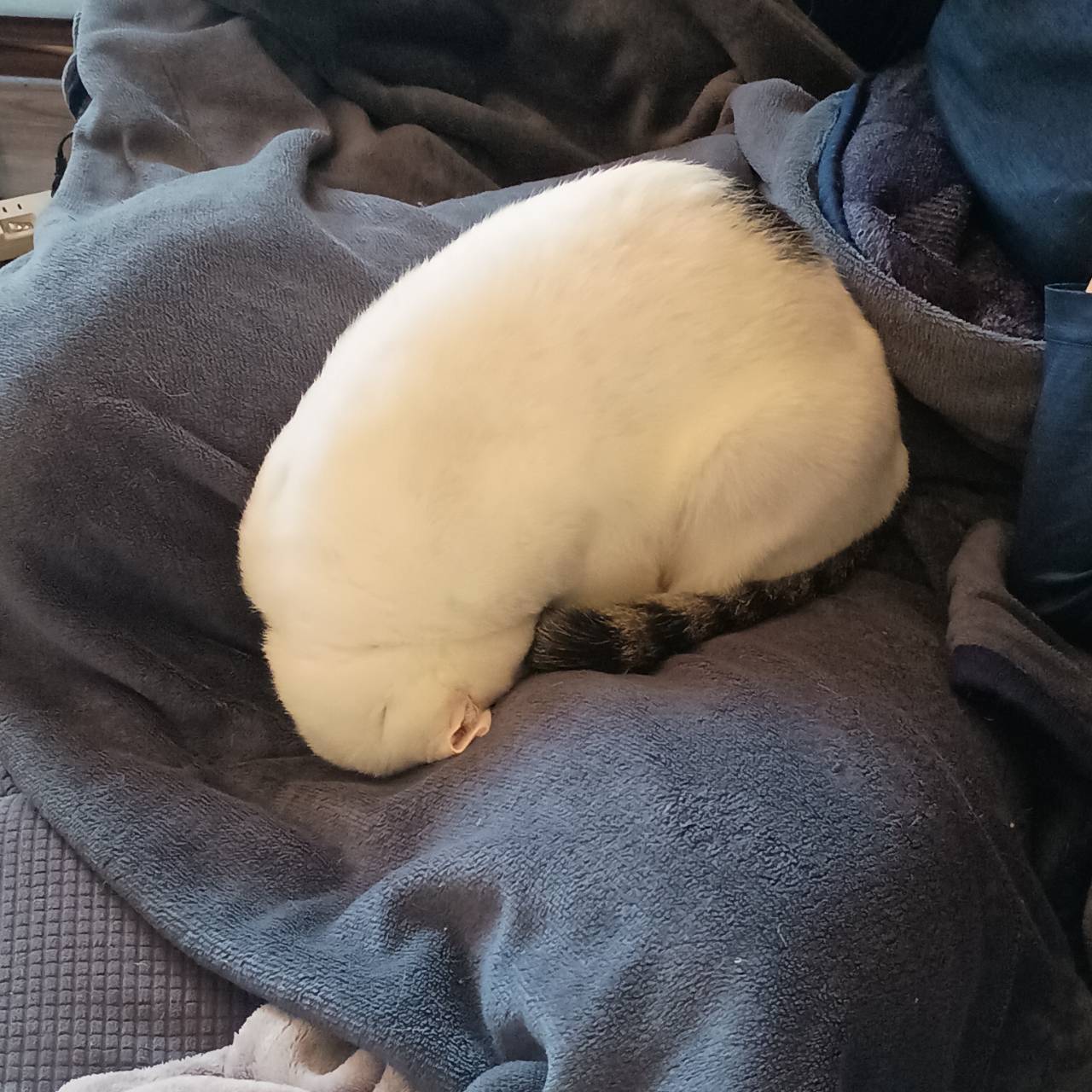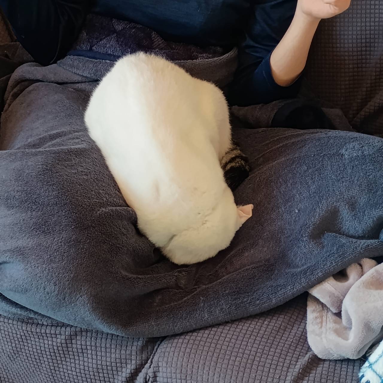 ソファに座った娘の膝の上で、頭おしつけて寝ています。